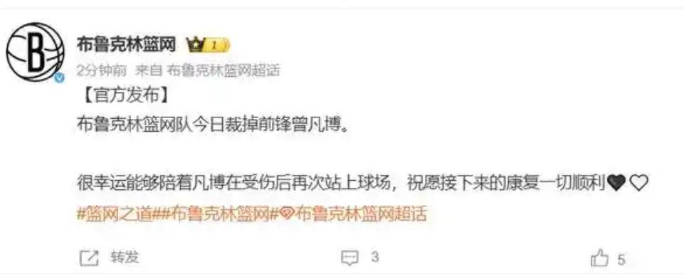 10月15日,布鲁克林篮网官方发了声明:球队裁掉了中国前锋曾凡博。简单几句话,后台瞬间炸锅,球迷刷屏:小曾加油!下次再冲!