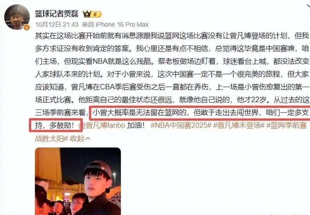 确实,凡博的旅程一路跌宕起伏,充满了苦辣酸甜。别看裁员是残酷的职业流程,小曾这次NBA季前赛登场,穿篮网球衣,已经是中国篮球少有的荣耀,顶着压力就能算大胆逐梦。