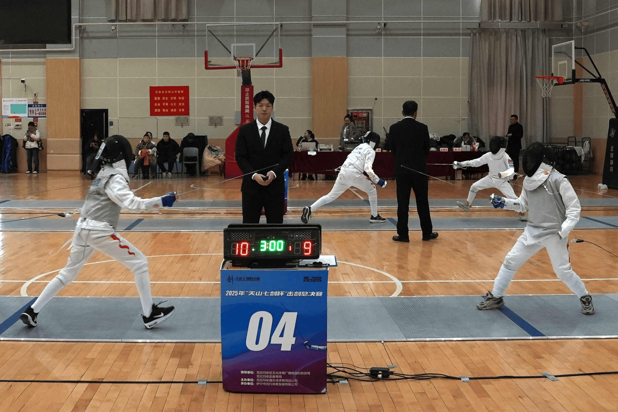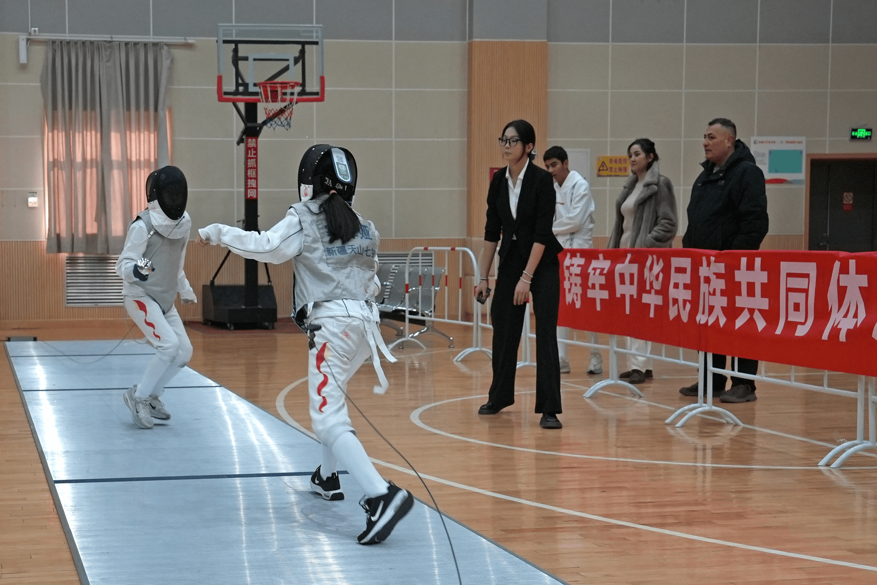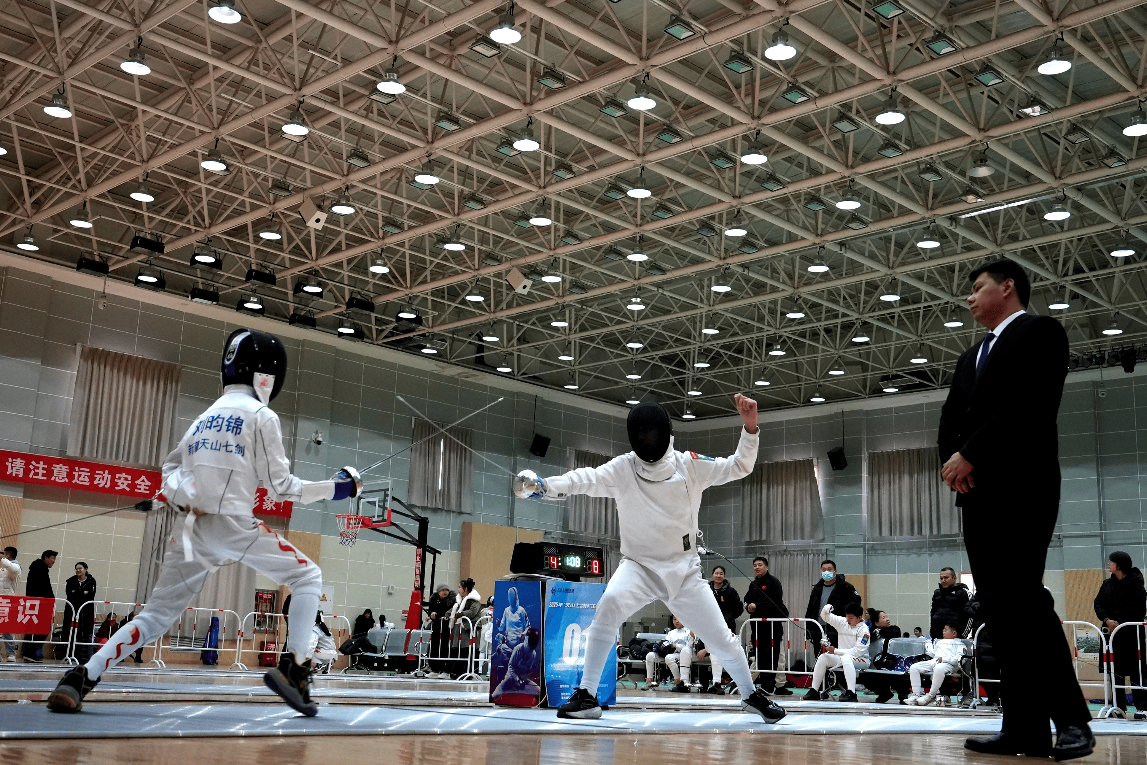 本次赛事在克拉玛依市康城小学体育馆进行,场地严格遵循国际击剑赛事的标准打造:剑道平整且富有弹性;灯光系统设计科学合理,亮度均匀且无眩光,为选手们提供了清晰的视觉环境。