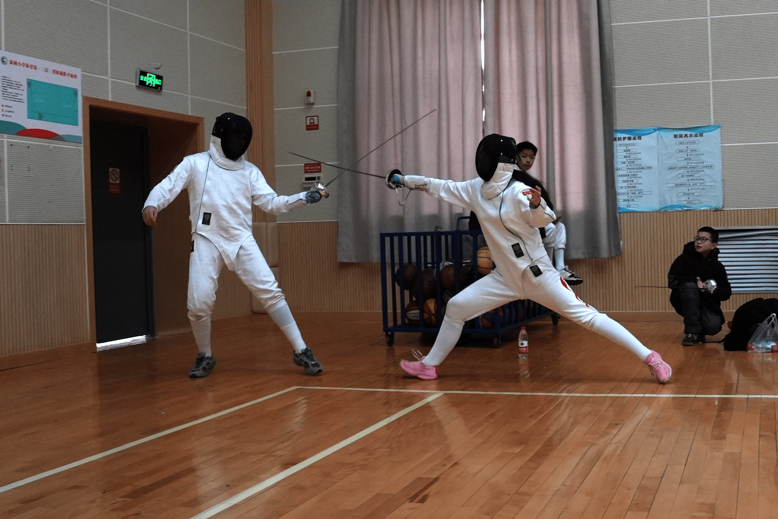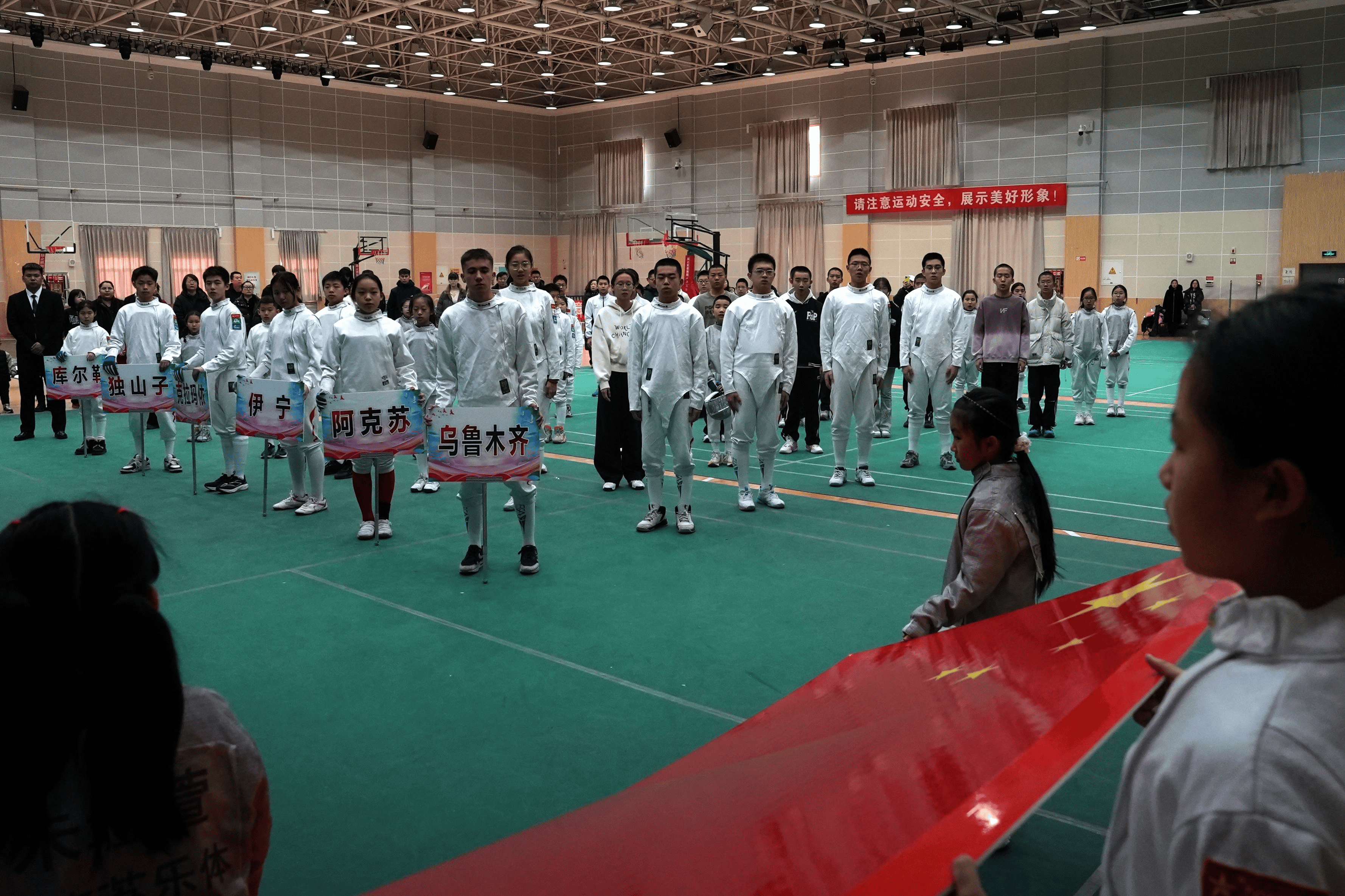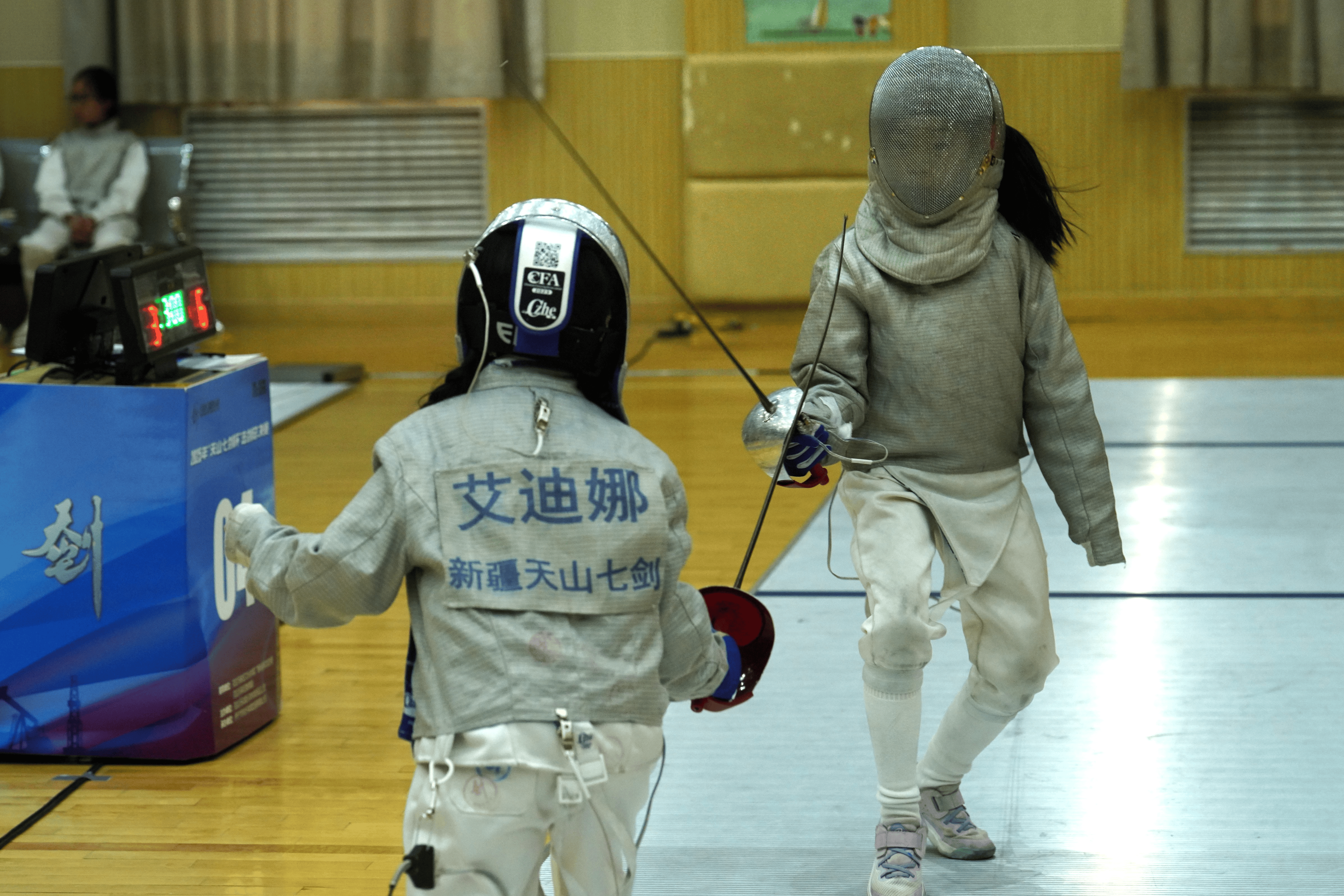 本次赛事在克拉玛依市康城小学体育馆进行,场地严格遵循国际击剑赛事的标准打造:剑道平整且富有弹性;灯光系统设计科学合理,亮度均匀且无眩光,为选手们提供了清晰的视觉环境。