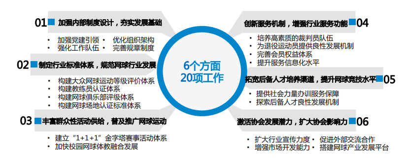 落实“上海网球三年行动计划”,加强内部制度设计,夯实发展基础;制定行业标准体系,规范网球行业发展;丰富群众性活动供给,普及推广网球运动;创新服务机制,增强行业服务功能;拓宽后备人才培养渠道,提升网球竞技水平;激活协会发展潜力,扩大协会专业影响力。