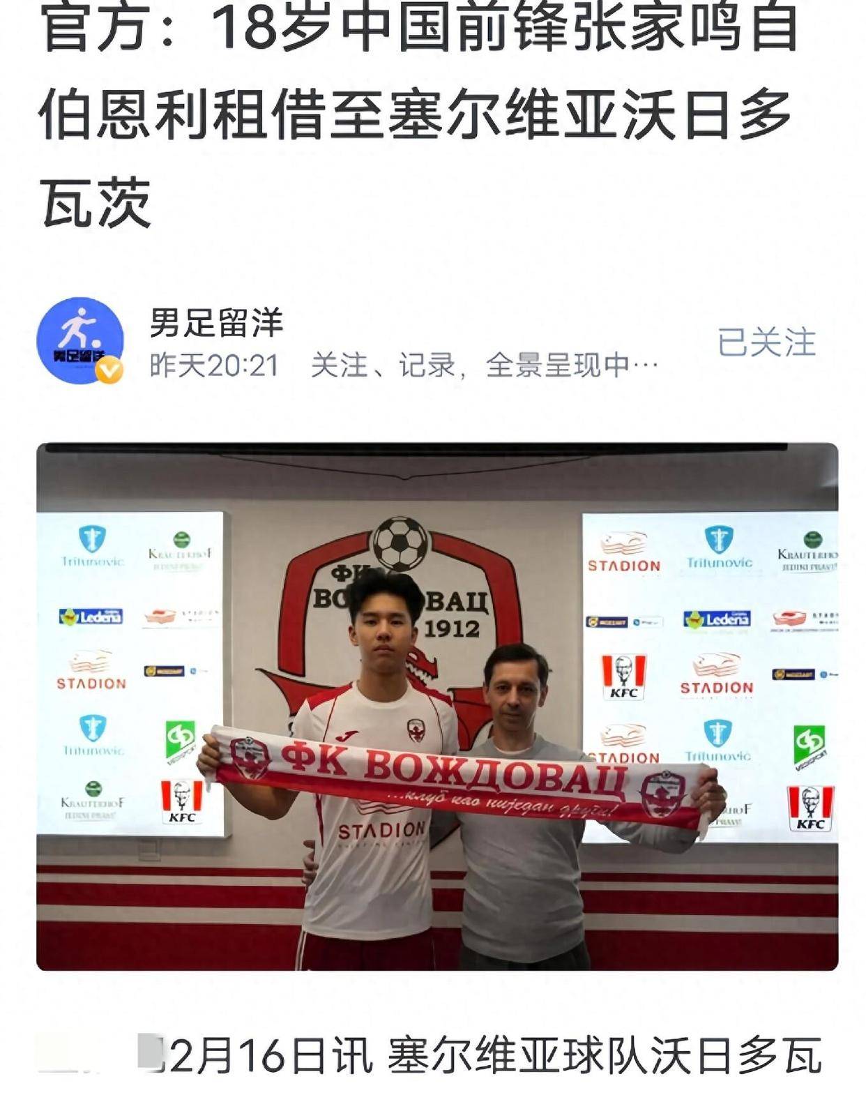 18岁的张家鸣,从英超伯恩利俱乐部出发,被租借到了塞尔维亚甲级联赛(第二级别)的沃日多瓦茨队。几乎在同一时间,16岁的万项,直接与塞尔维亚超级联赛的霸主贝尔格莱德红星俱乐部签下了一份长期合同。
