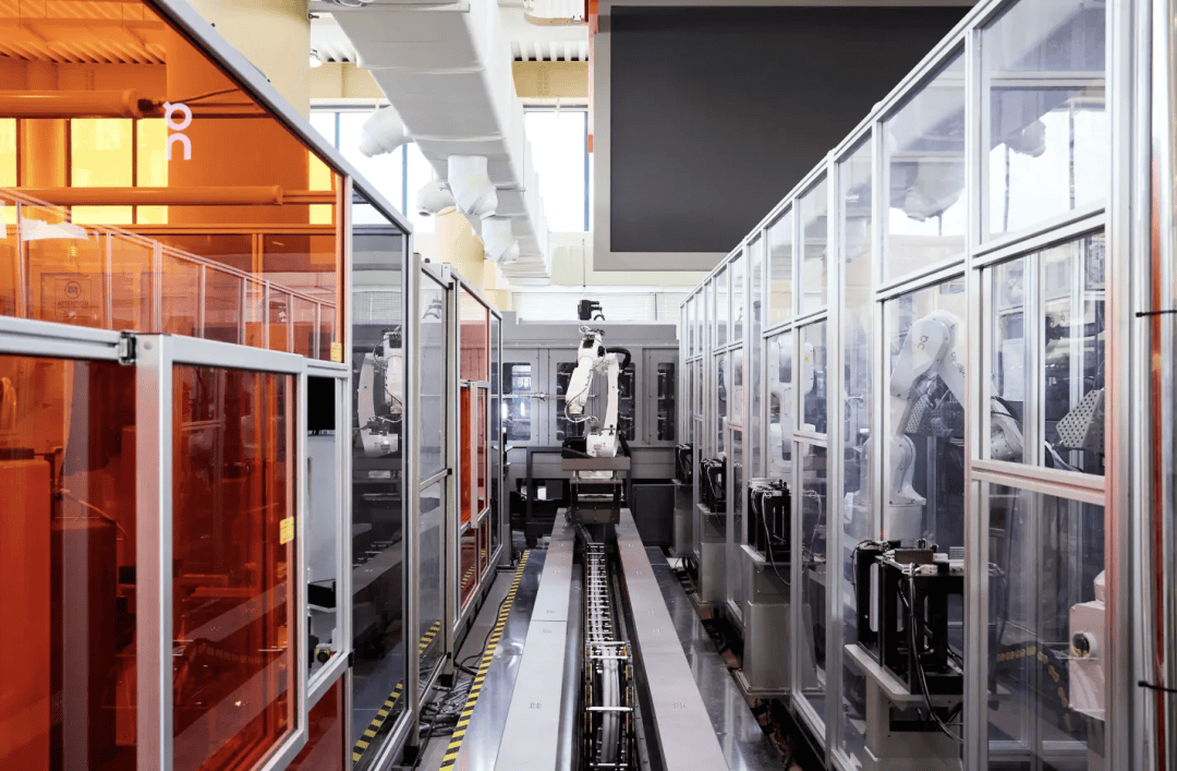 公司在声明中指出,新工厂位于釜山附近,内部配备32台专门生产运动鞋鞋面的全自动机器人。此举将使 On 的机器人化产能提升至原来的30倍。釜山工厂日均产能约1000双,喷涂工艺将传统需跨多家工厂、共200道工序的鞋面制造,压缩为单一自动化流程。