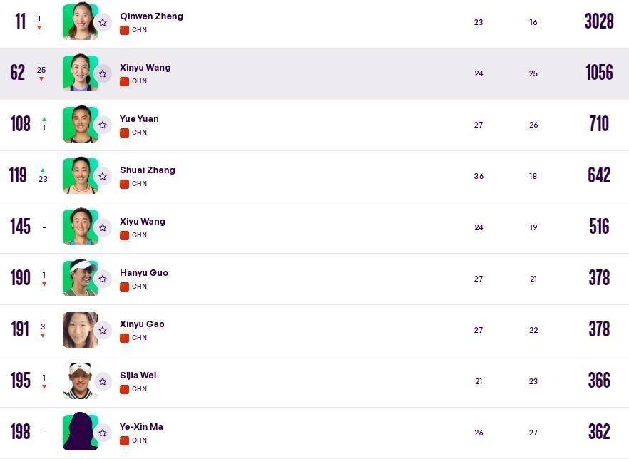 其他球员如袁悦(第108位)、王曦雨(第145位)均徘徊在百名开外,中国女网前100球员仅剩两人的现状,创下近年新低。