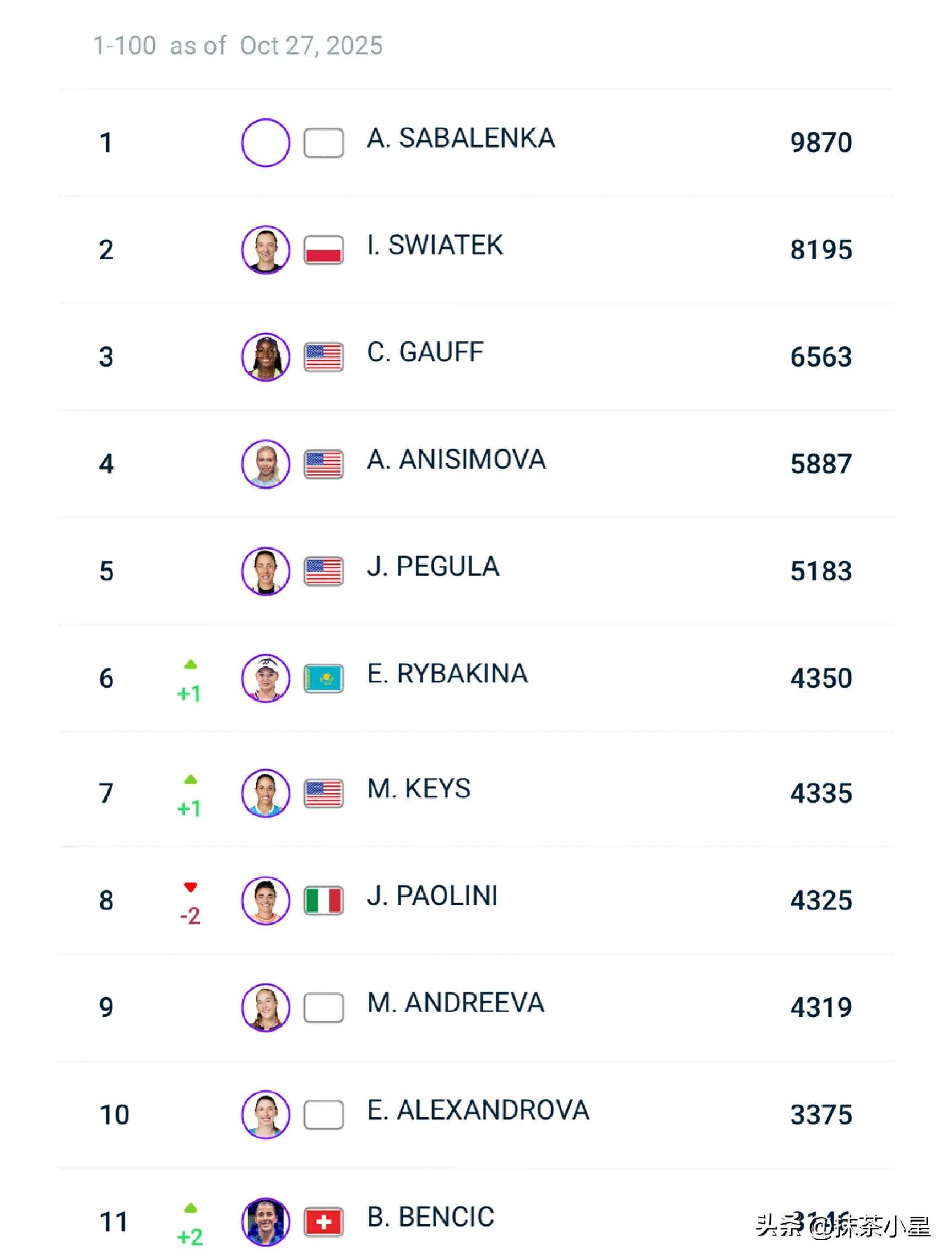 TOP10当中唯一排名下滑的是鲍里妮,下跌2位降至世界第8,凯斯则顺势反弹1位来到世界第7!此外,TOP5排名没有变化,依然由萨巴伦卡、斯瓦泰克、高芙、阿尼西莫娃和佩古拉把持,5人的积分都超过了5000分。