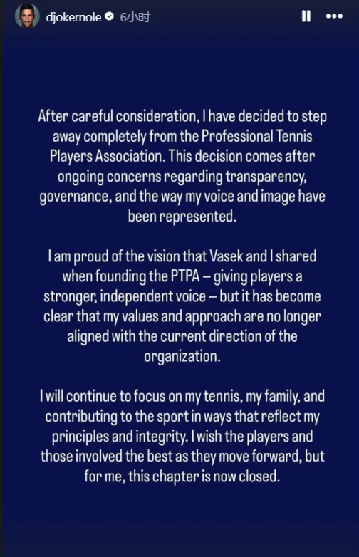 德约科维奇在社媒中写道:“经过慎重考虑,我决定完全退出职业网球运动员协会(PTPA)。这一决定源于对透明度、治理方式,以及我的声音和形象如何被代表的持续担忧。