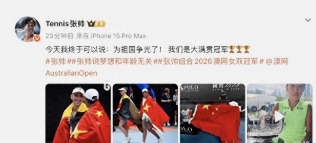 这次夺冠,为她带来了56.2万澳元的奖金份额,折合人民币超过273万元,是本届澳网中国选手中收入最高的一位。但比奖金更重的,是那份沉淀了近二十年的情感。夺冠当晚,她在个人社交媒体上更新了动态,只有一句话:“今天我终于可以说:为祖国争光了!我们是大满贯冠军。”这条动态在几小时内获得了超过50万点赞,评论区被“祖国为你骄傲”的留言刷屏。