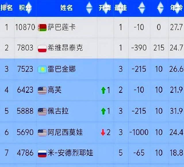 相比于前两名的稳定,中间梯队的变化则更为显著。高芙虽然在多哈早早出局,排名却意外上升,而佩古拉甚至未参赛,也依旧保持在前五。反观卫冕冠军阿尼西莫娃,由于首战失利,被扣除大量积分,排名大幅下滑。这正如我们身边那些平时默默无闻,但地位稳固的人,而一次失误却可能让他们付出很长时间才能弥补。