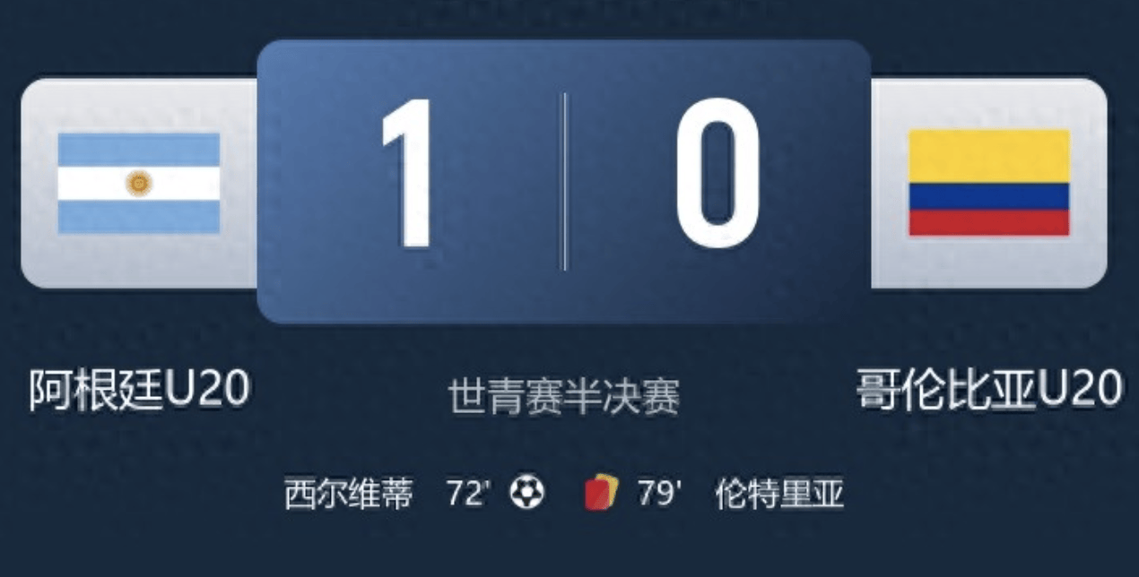 10月16日清晨,智利国家体育场迎来了世青赛第一场半决赛——阿根廷U20与哥伦比亚U20的交锋。比赛开场阶段,巴比多次精彩的扑救帮助阿根廷化解险情,阿里萨拉的远射一度威胁球门。易边再战,普雷斯蒂亚尼送出妙传,西尔维蒂冷静推射打破僵局。临近结束,哥伦比亚的伦特里亚因两黄变红被罚离场,最终阿根廷以1比0小胜对手,实现六连胜的壮举,成功闯入决赛,将迎战另一场半决赛的胜者摩洛哥队。